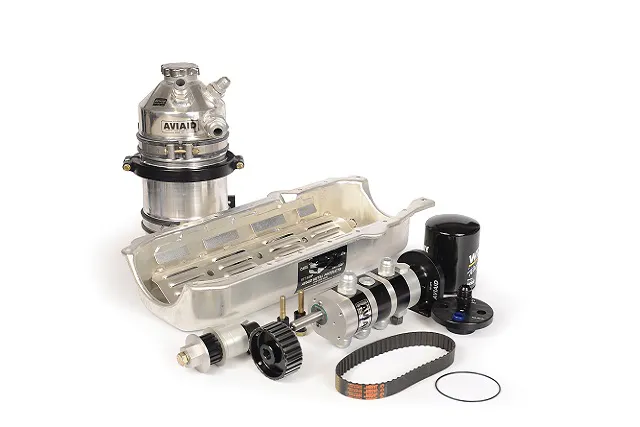 The G-Line kits include a custom dry sump oil pan, 3-stage dry sump pump, mounting brackets, pump drive and belt, dry sump tank and bracket, a remote filter mount, filter adapter and filter.
