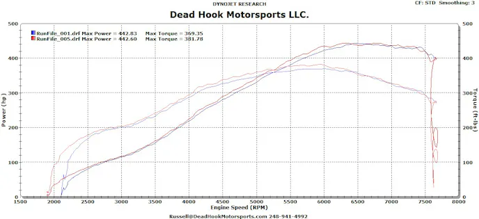 The EcoBoost’s engine’s management system is hard-coded to prevent RPM levels above 7,700, the engine is limited to that parameter, and the only way to increase performance is with more boost, not more RPM. In this instance, the engine is tuned with an Accessport system and software from COBB Tuning.