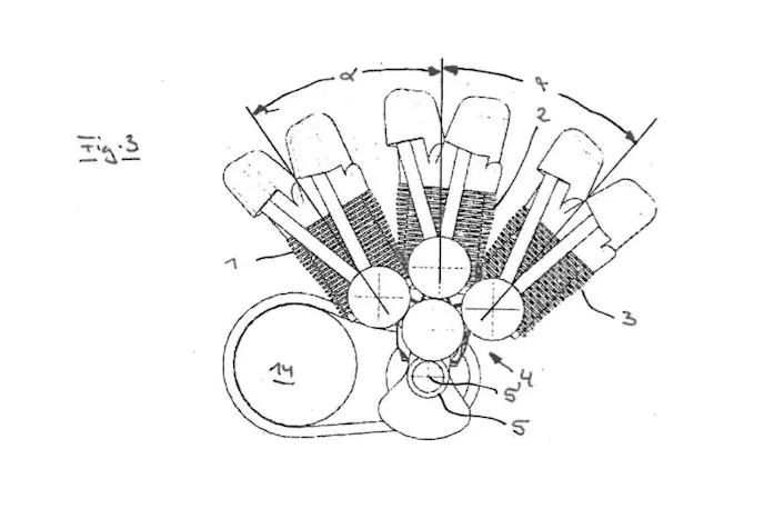 In both designs, the layout shows somewhere around 65-75° separation between the end cylinders, like a traditional V-style engine. There are two different engines pictured – the one above has three cylinders and three crankpins, operating much like an inline triple cylinder-style engine.