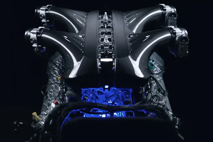 They explained that the choice for a V16 focuses on delivering emotions and feelings from the customer, the drivability of a V16, and the engine sound. Electric motors providing the instant torque and power fill the gaps typically handled by turbochargers.