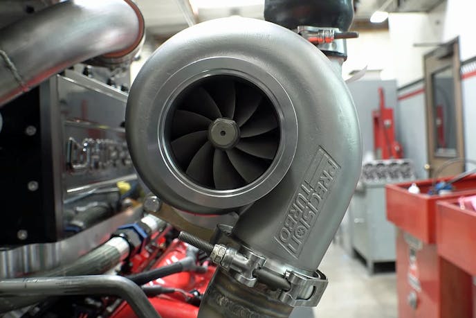 All that flow is needed to drive the twin Precision 6870 ball-bearing turbochargers Banks has chosen for the build. “These have a 2618 forged-aluminum compressor wheel, and a 713C Inconel turbine wheel. The dual ceramic ball bearings will help increase response time, too,” says Banks.
