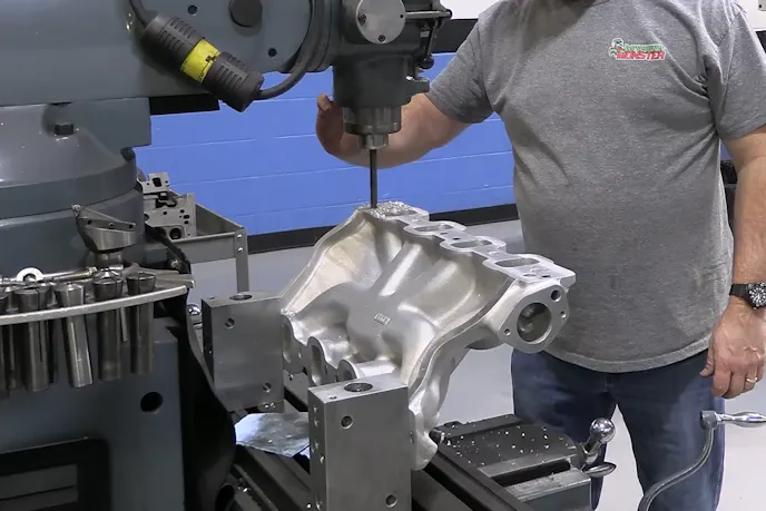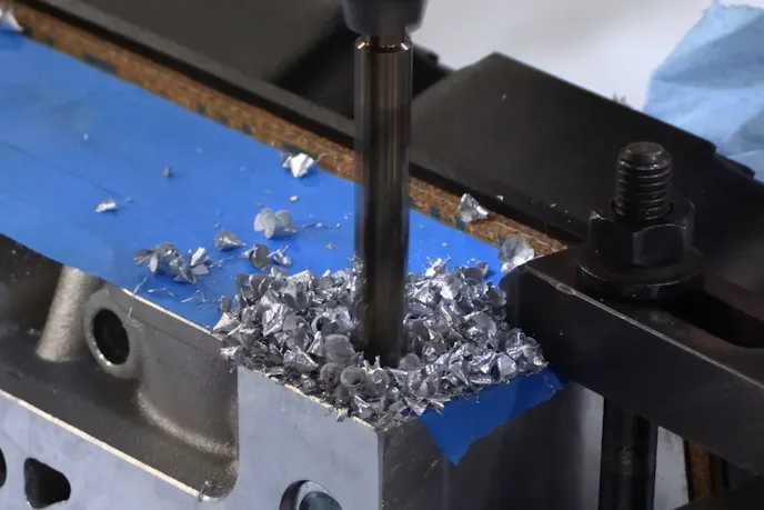 Then, to replace the blocked-off passages, you must drill a new coolant passage in the head. Once again, Trick Flow knows that Clevors are a thing, so they actually dimple the location in the head where you need to drill a 1/2-inch hole. If you’re using an OEM Windsor block, you’ll need to drill a few holes in the deck of your block to match up as well, but since Huneycutt is using an aftermarket block, those passages are already there, as they are in most aftermarket Windsor engine blocks.