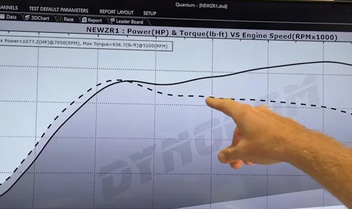 If you’ve been following Cleetus, then you probably know that earlier this month, he swapped downpipes on the C8 ZR1 and made 1,077 horsepower and 936.7 lb-ft of torque at the wheels on their chassis dyno. Perhaps most impressively, it starts making 1,000 horsepower at about 6,000rpm and continues to carry that to 7,500. That’s all with the stock tune, which seems to kick in torque management around 7,000rpm or it may have easily exceeded 1,100 horsepower.