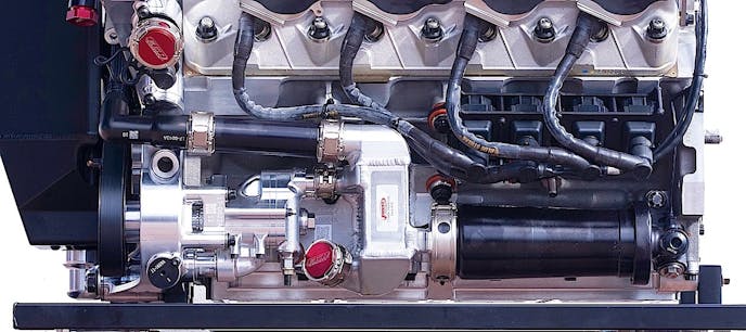 The block is a special aluminum casting but still retains familiar LS/LT dimensions, such as the 4.40-inch bore spacing and 9.240-inch deck height. The Precision Racing Components lubrication system features a split dry-sump design where the 4-stage scavenge pump and air-oil separator are located on the right side of the engine. The pressure side of the system is belt-driven on the left side of the engine and includes the filter and heat exchanger. Between the two side of the dry-sump system is a 2-gallon oil reservoir mounted in the front plate. Also in the front plate is the water expansion tank, so the engine can be pulled from the car as a unit without disconnecting any coolant or lubrication hoses. As noted earlier, the engine is a semi-stressed member of the chassis, basically acting as a spine for the carbon fiber monocoque.