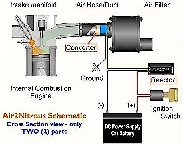 A closer look at the company’s website reveals a 2-piece design consisting of the “converter,” which resembles a very crude MAF sensor, and the “reactor,” which looks like a basic ECU. According to the illustrations on the website, the converter is located between the air filter and the intake valve of a diesel engine. And that’s where the magic happens: Quoting directly from the website: “At this point the air is subjected to ‘electrical discharges’ produced by the Reactor. This process dissociates the Nitrogen (N2) and Oxygen (O2) from the atmospheric air, transforming it into Nitrous Oxide (N2O), a highly enriched air/fuel mixture.”