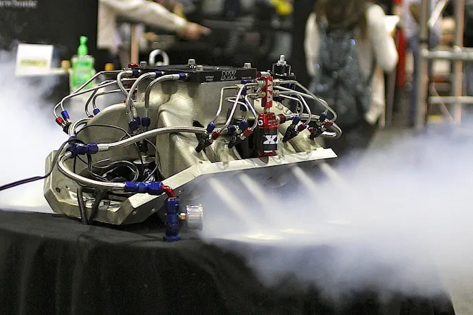 First, even the most naïve hot rodder who was brought up believing everything that happens in the “Fast and Furious” movies is true will know that nitrous oxide is not a fuel, let alone a “highly enriched air/fuel mixture.” Nitrous oxide is simply an oxygen-bearing compound consisting of two nitrogen atoms and a single atom of oxygen, or N2O. Normally a gas, nitrous oxide turns to a liquid when stored under very pressure, as in the familiar 10- or 15-pound bottles. When released into the atmosphere nitrous oxide cools dramatically, resulting in a very cold, dense charge of air. When introduced into the heat of a combustion chamber, the oxygen breaks free of the nitrogen to help accelerate the burning of the fuel. For nitrous oxide to be effective in an engine, additional fuel must be added to maintain the correct air-fuel ratio. Nitrous oxide without additional fuel will lean out the engine significantly.