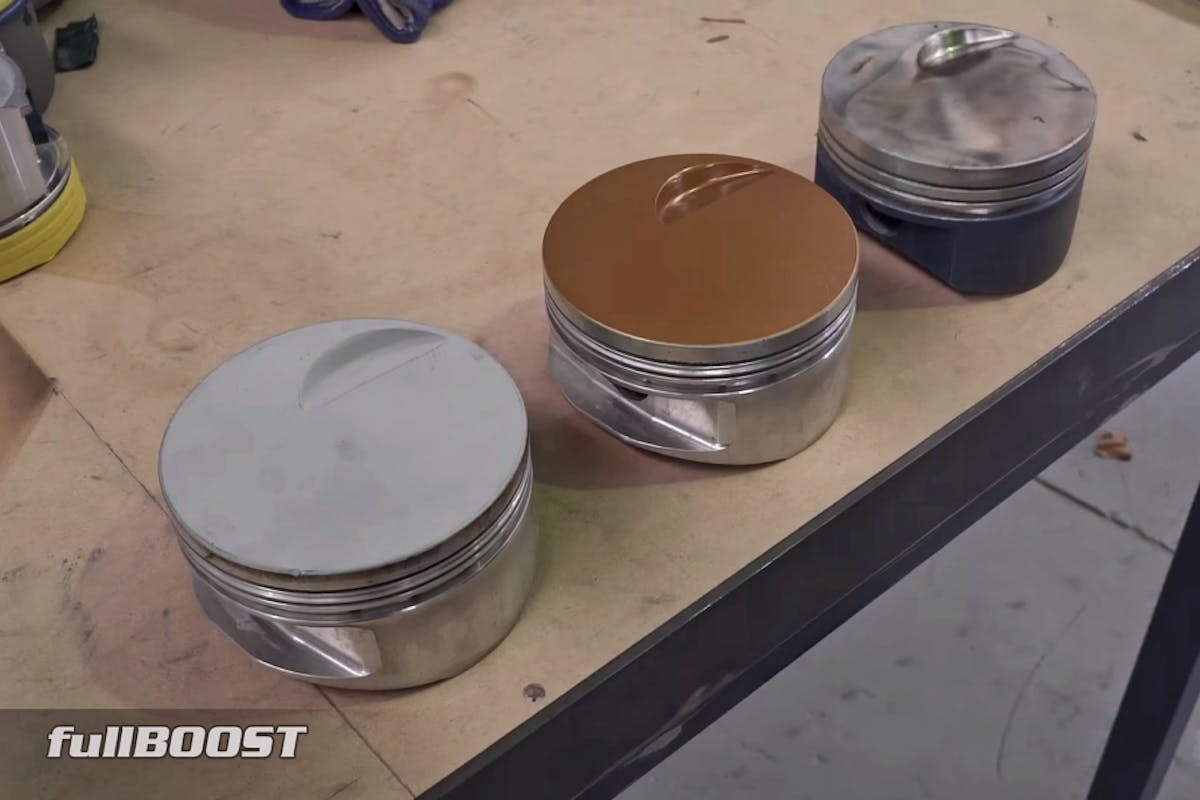 The three pistons tested in the video. From Right to Left, is an uncoated crown, the “Premium Gold” ceramic coating, and the “Premium Turbo” ceramic coating.