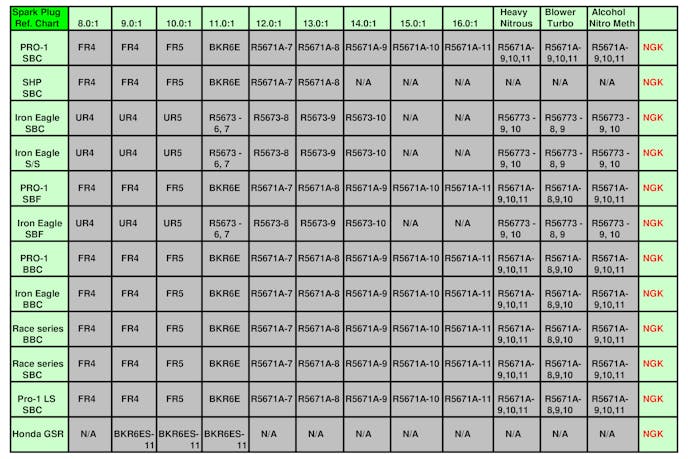 This chart from Dart helps get you to a solid starting point on plug choice. On the right-side Y-axis is the particular model of Dart cylinder head, and the X-axis is the defining feature of the engine’s combination, be it compression ratio for a gasoline-powered naturally aspirated combo, or forced induction type, or even alcohol-based fuels.