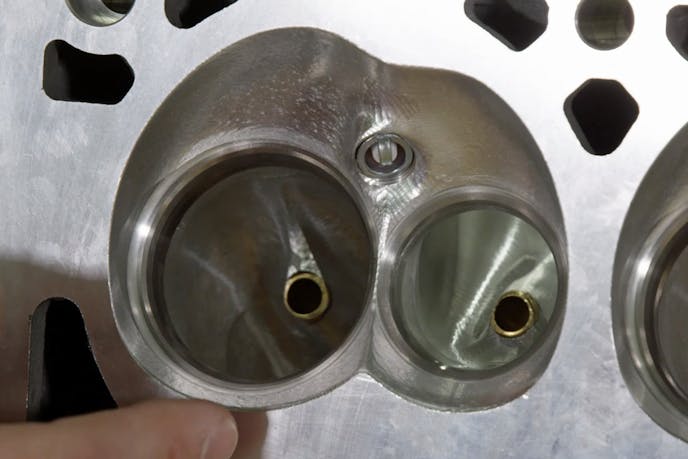 Here you can see what the proper thread length looks like in the combustion chamber. This combination is a non-protruding electrode, but a protruding electrode would put the spark deeper into the combustion chamber. Heat range would affect the shape and location of the insulator inside the plug, and wouldn’t change the location of the ground strap or electrode tip.