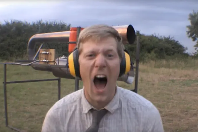 Ever the mad scientist/lovable anarchist, Furze opted to point his massive jet to the east and his French neighbors. The deafening roar of the jet is sublime and profane simultaneously — and we love it. The orange glow of the engine reminds us of the intensive thermal energy fueling the expansion and growling from the flared trumpet like some kind of otherworldly beast.