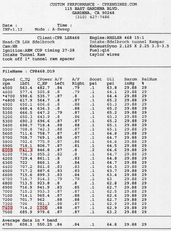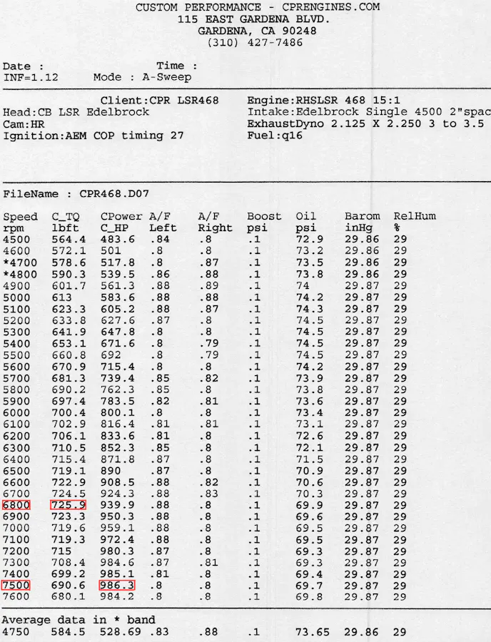 With Edelbrock’s single plane EFI Super Victor LS-R intake manifold bolted on top of this 468 cubic inch hydraulic roller LSX, CPR Engines managed to crank out an impressive naturally aspirated 986.3 horsepower at 7,500 rpm and 725.9 lb-ft of torque at 6,800 rpm on Q16!