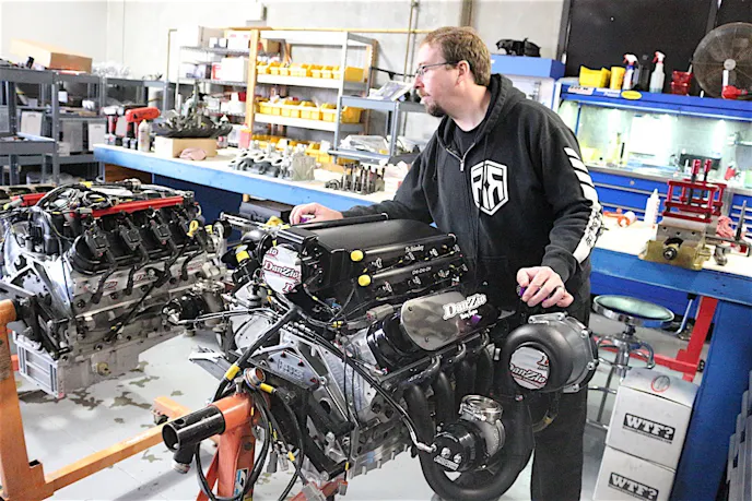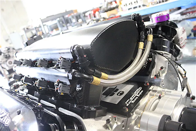“We use a Hogan’s intake that we designed, it’s a carry over from the Gen I engine but when we went to this Gen II engine we ran out of fuel with eight injectors so we had to go double. A lot of guys will run a bigger injector, and there are companies that make a bigger injector. We used 16 injectors so we can get enough fuel in there,” Muzio explained.