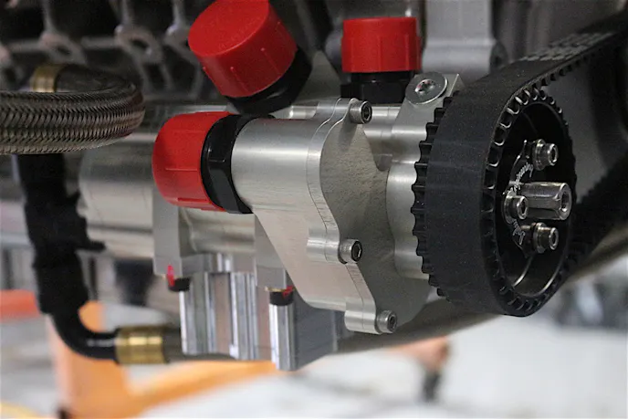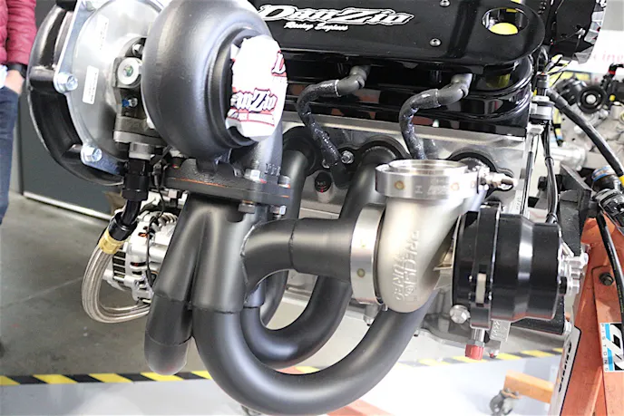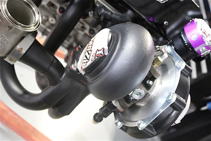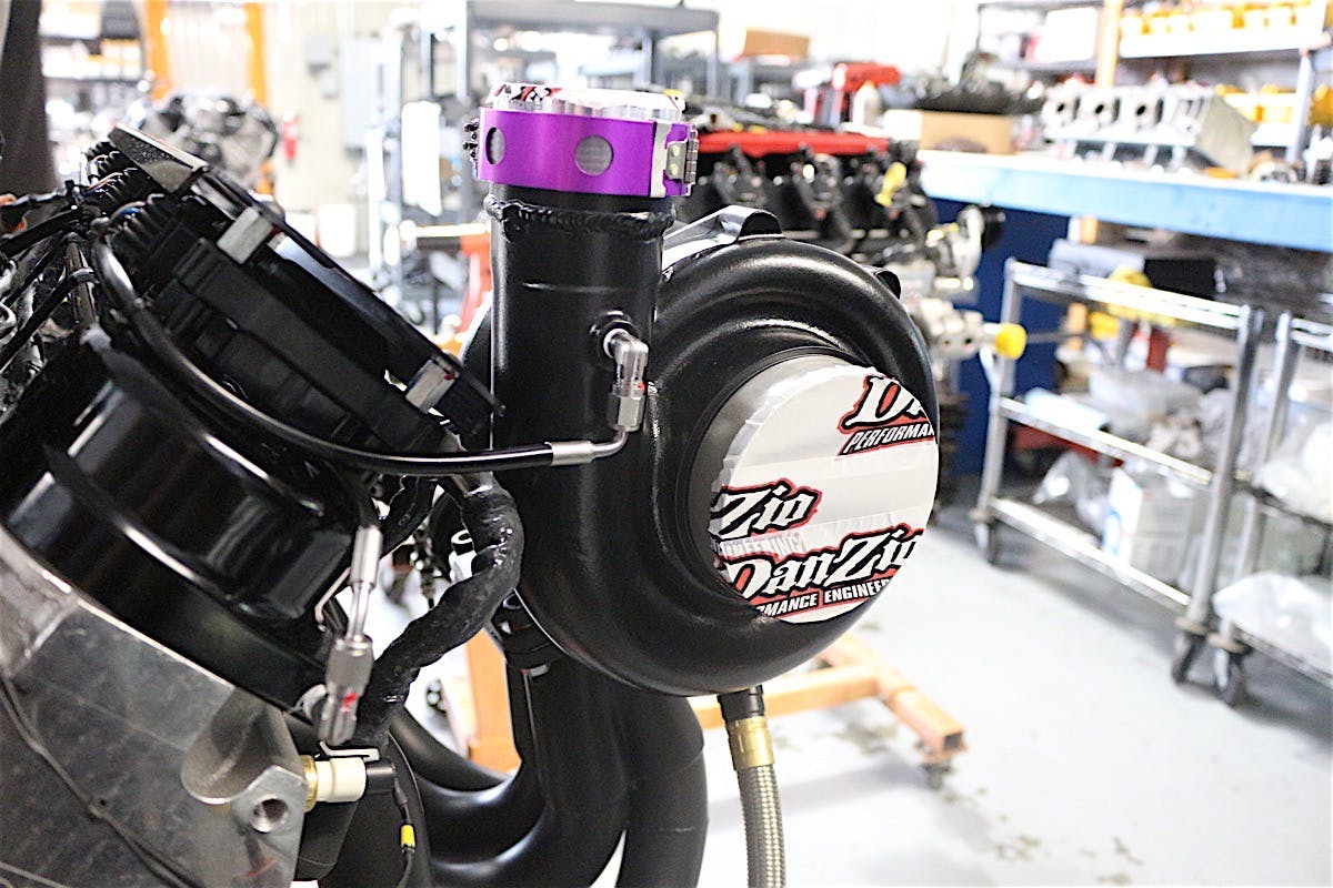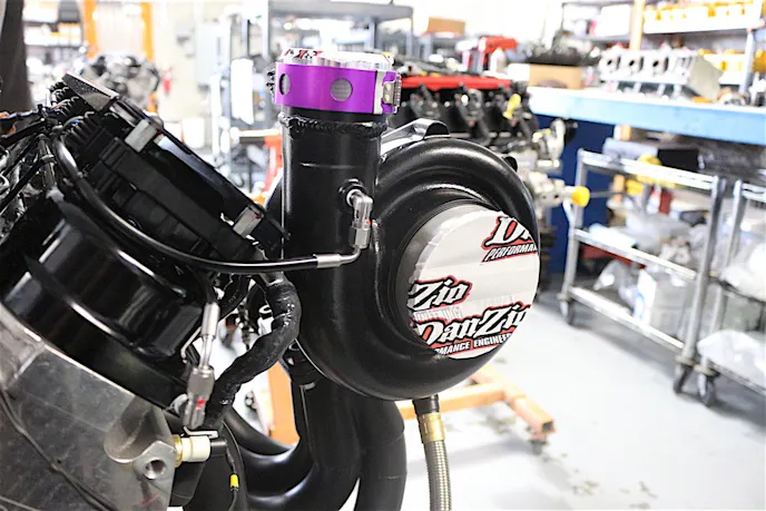 “This is our first time running billet symmetrical turbos, we put the Wiggins clamps on there because we run 25-30 pounds of boost in these engines,” Muzio continued. Keeping the engine and turbos lubricated is a Dailey Engineering dry sump system. “We use a Dailey Engineering dry sump with a turbo scavenge section. We actually scavenge the oil out of the turbochargers,” he emphasized.