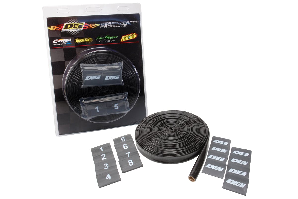 DEI’s Silicone Protect-A-Wire kit includes 25 feet of 3/8” ID silicone covered annealed silicone coated fiberglass sleeving with heat resistance to 400°F, eight DEI branded tube ends, and eight consecutively numbered (1-8) tube ends to label plug wires for added assurance they are connected to the correct cylinder.