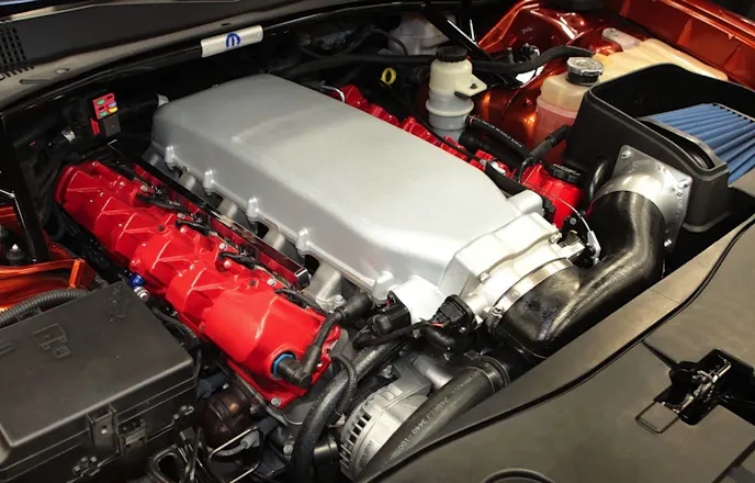 No word on how Mopar detuned the engine. The 800-horsepower version, which lists for nearly $40,000, has a 12.5:1 compression ratio, so a little less compression to make the engine more streetable on pump gas is a likely possibility. Also, the JTEC controller has probably been reprogrammed with milder manners.