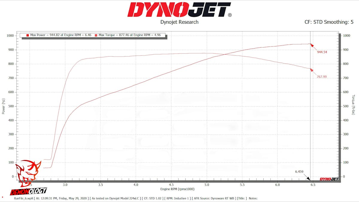 Once the rollers stop and the graph comes up, it’s clear, the previous dyno at AMSOIL wasn’t “just excuses.” With peak power — at the rear wheels — of 944.82 horsepower at 6,459 rpm and peak torque of 877.46 lb-ft at 4,960 rpm, there is no doubt that the engine is making the claimed 1,000 horsepower. No matter what kind of drivetrain loss you factor in, this Hellephant is a beast.