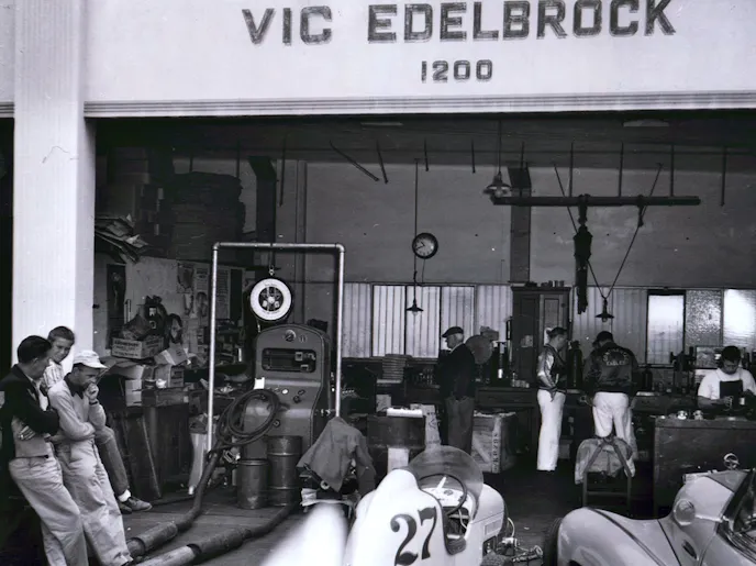 Vic Edelbrock Sr. was one of the first hot rodders to invest in a dyno, purchasing a Clayton model in 1948. The garage photo shown on this page was taken at Edelbrock’s first shop on North Highland in Hollywood, California. A year later Edelbrock set up shop on the famed “Thunder Alley” in Culver City, a section of Jefferson Blvd. that was home to Isky Cams, Hedman Hedders, Traco Engineering, Dick Gulstrand and even James Garner’s race shop.