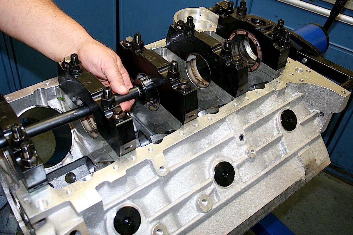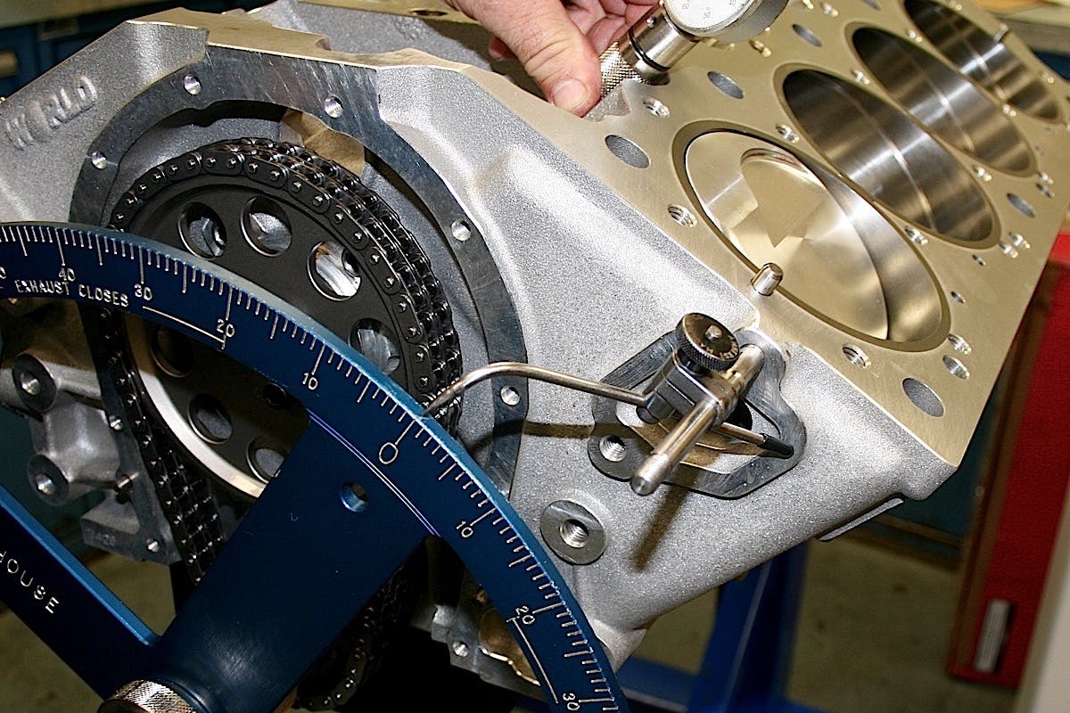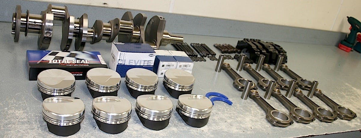 Besides the World/BMP block and Scat crank, the short-block comprises Scat 6.385-inch H-beam rods, custom 10:75:1 pistons, Total Seal rings, Clevitte bearings, Cloyes timing chain, Cometic gaskets, ARP fasteners and Moroso pump and oil pan.