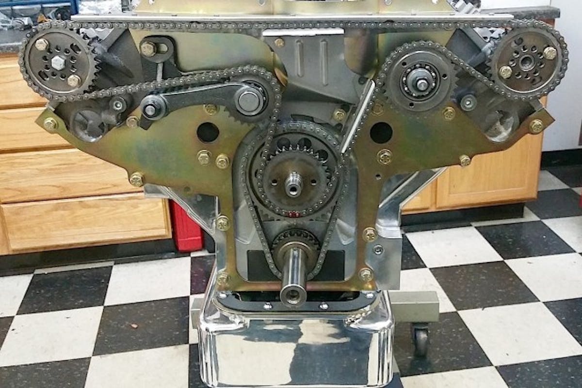 The Bill Coons cylinder heads were treated to a mild porting, port matching to the intake and a “nice” valve job. Survival tried two different sets of camshafts before settling on a Crane model supplied by the owner. The Coons front drive hardware is rather standard for a modern SOHC build, although Survival upgrades to studs on the idler and tensioner to support the iconic 6-foot chain. There’s always been some mystery to the timing strategy with a SOHC engine The legendary Ed Pink used special bushings to offset the difference between the “driven” cam and the “lagging” cam.
