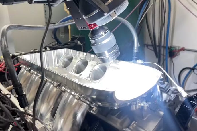 “We set the dyno, started it up, and it caught it,” says Strader of the successful initial run. “So then I had the thought, ‘if it can do that, what else can we do?’ We got this wild idea that we wanted to see what was going on inside the engine. What is unique about the Godzilla, is that the fuel injectors are cast into the cylinder head.” I’m sure you can see where this is going.