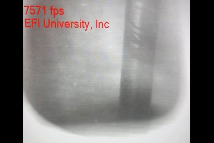 “At 6500 rpm, the intake valve is opening and closing 54 times per second. We are able to record almost 7,600 frames per second, so you can see every movement of the valve opening and closing, as well as the fuel movement,” Strader explains. At that speed, you can see the pressure waves moving the fuel (both in droplet and vapor form) around the valve as it opens and closes.