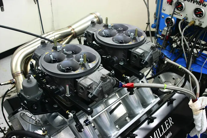 The engine is based on a Donovan alloy block with Reher-Morrison Raptor 12-degree heads with selected goodies from Comp Cams and Jesel. Mike Miller Racing Engines handled the assembly. The Holley carbs feature all-aluminum construction to save weight, large fuel bowls, 3-circuit metering and are fully adjustable for precise tuning.