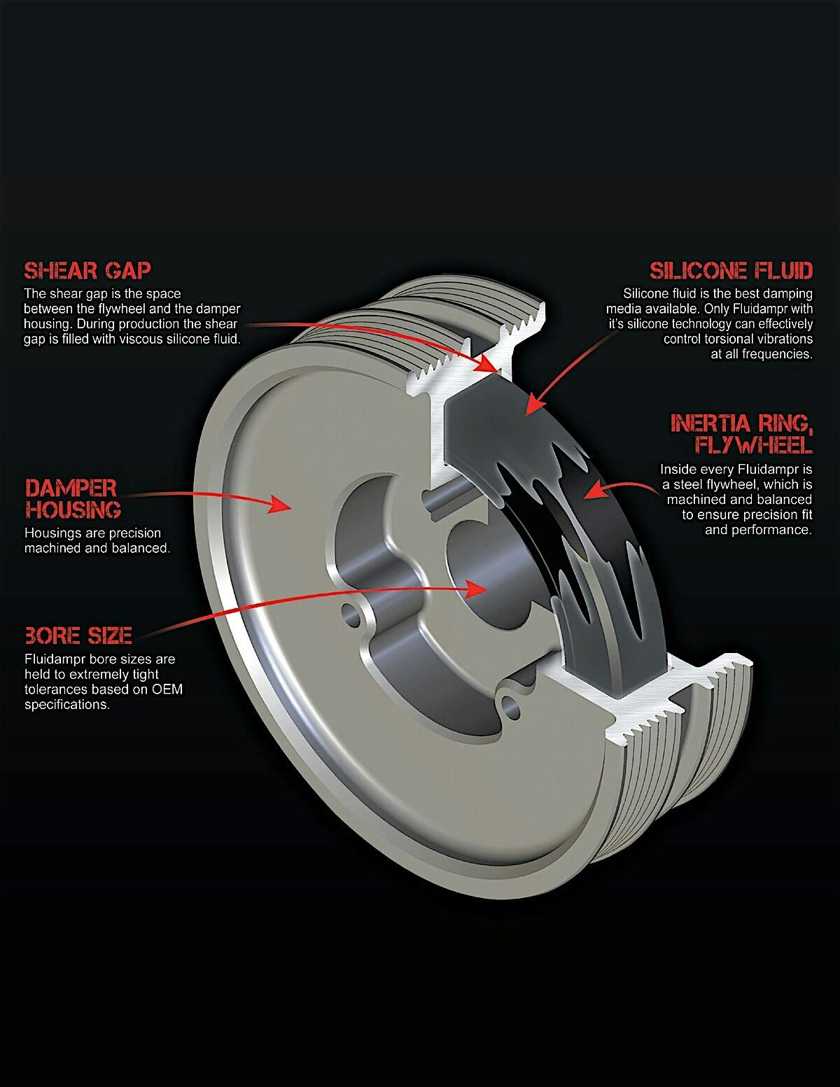 “Silicone is more thermally stable and durable over conventional rubber. This is one reason we find silicone or silicone blends incorporated into a wide variety of automotive parts today. In terms of controlling engine harmonics, silicone is a superior dissipater of heat. This allows it to provide consistent performance and long term durability. Fluidampr performance dampers use a proprietary silicone that maintains the viscosity tolerance needed for reliable damping across an extreme temperature range of -40 degrees F to 300 degrees F,” LeBarron explained.