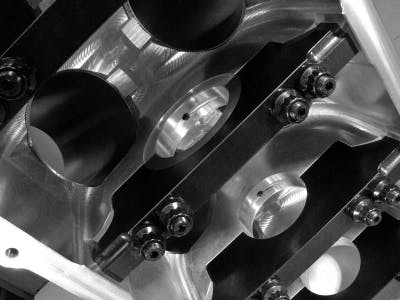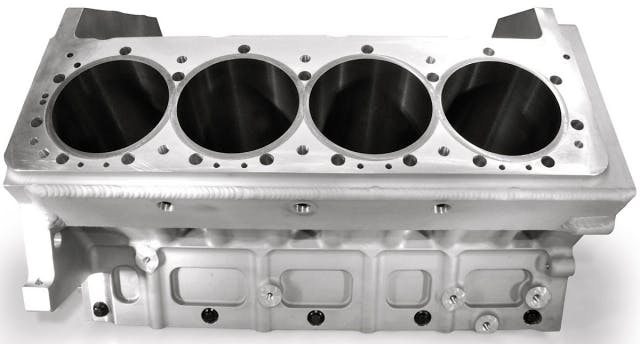 The block — which is machined from 6061-T6 aluminum billet — is available with or without coolant passages. Drawing from the Gen I style, it sports a 5-bolt-per-cylinder pattern or 19 total head bolts.