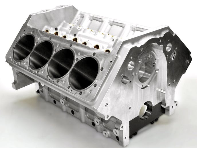 The block — which is machined from 6061-T6 aluminum billet — is available with or without coolant passages. Drawing from the Gen I style, it sports a 5-bolt-per-cylinder pattern or 19 total head bolts.