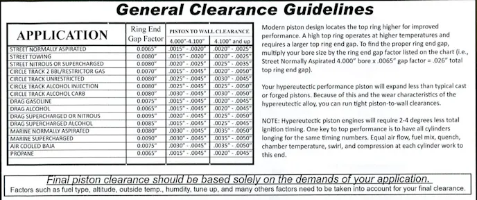 Your bore size plays a large part in the clearance needed as well, as a larger piston has more material and will expand more than a similar piston of a smaller size. For example, on the small end, JE Pistons lists the minimum clearance for a small-bore 2618 piston as low as .0030 inch, but lists up to .0050 inch of clearance for a large-bore piston of similar construction.