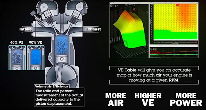 Engine management computers, software and interfaces vary in structure, ease of use and schools of thought. Among some of the most advanced methods is volumetric efficiency-based tuning. Volumetric efficiency (VE) tuning works on the principle that a given engine makes concessions and trade-offs to optimize a powerband suited to it’s unique application. An engine that exhibits very high volumetric efficiency in one area of the power curve will likely suffer in another area. Volumetric efficiency is simply the percentage of actual cylinder displacement being moved through the engine, inertial effects and timing play a great role in this determination so VE is highly rpm-driven.