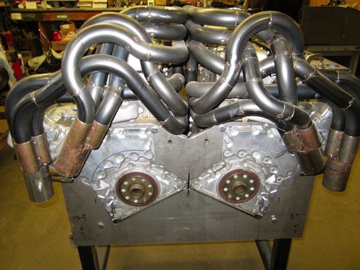 This snake nest of header pipes comes from a pair of BMW 5-liter V12 engines joined at the hip.