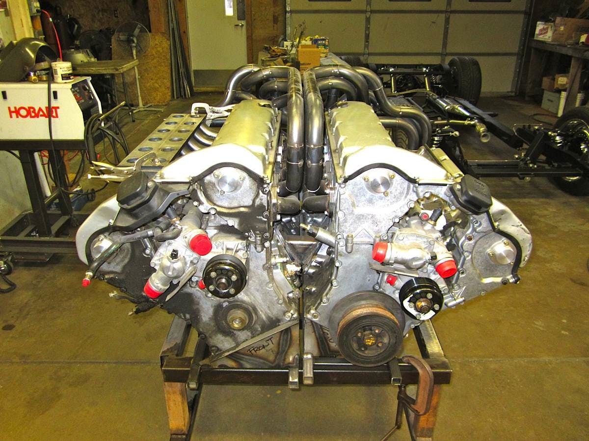 As you can see from the front view, only half the pipes have been fabricated for the W24 engine. As soon as the headers for the outside cylilnder banks have been made, the engine will go on the dyno.