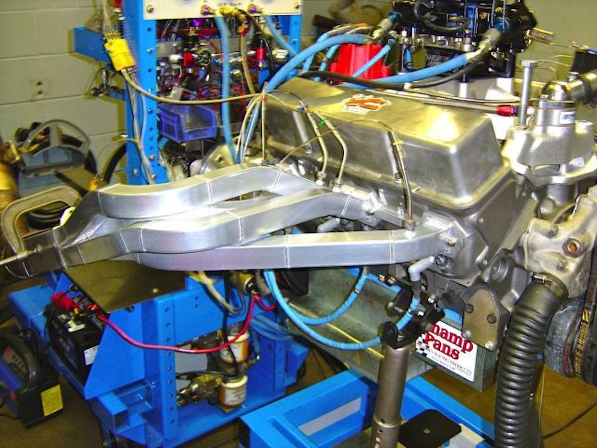 Speaking of headers, here’s a set of square-tube pipes on a circle-track engine. The square tubes didn’t make any more power than traditional round-tube, but Quarnstrom says there’s a movable device in the collector that allows adjustment of the torque curve. Below, the 180-degree headers are on Ford 351 Windsor destined for a mid-engine road-race car.