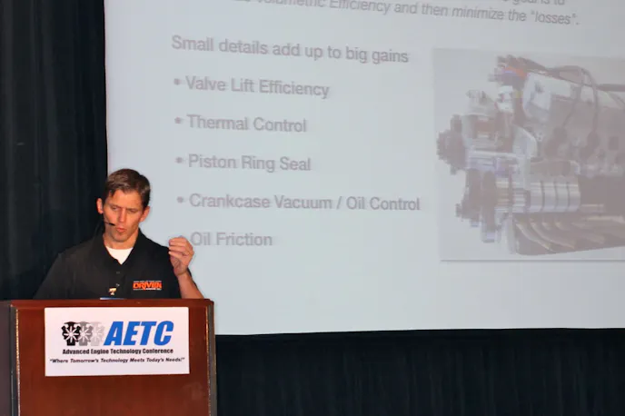 Continuing with the theme of finding hidden horsepower, Speed focused on a number of engine functions that can rob horsepower. While revealing the results of a government study that showed where the parasitic losses occurred in a typical internal combustion engine, Speed noted that losses through pistons, valvetrain and bearings can account for 15 percent of IMEP (indicated mean effective pressure).