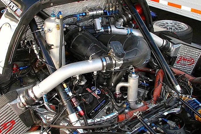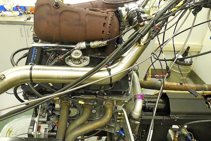 We first saw the race engine on the dyno at RoushYates following its introduction at SEMA a couple years ago. It looked a little different while running at Long Beach last year. And now you see the current configuration in the lead photo above.