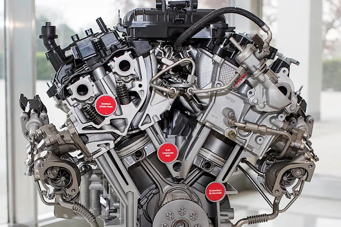 The latest 3.5-liter twin-turbo EcoBoost offers 30 lb-ft more torque than the previous model, peaking out at 450 lb-ft for a twin-turbo V6. Just like the race version, there are two fuel injection systems for each cylinder: a direct injection and port injection. The new 3.5-liter also features new turbos that provide additional boost, thanks to a lighter turbine wheel and electrically activated wastegates.