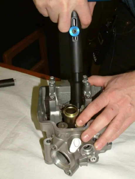 According to Goodson, using the Keeper Eeze tool is pretty straight forward. Simply determine the correct protective guide sleeve, the one that fits closest to the spring bucket bore diameter and the spring/retainer assembly. (In some small engine applications, the valve spring clearance relief is used as the tool’s guide). Then install the sleeve around the spring and retainer.
