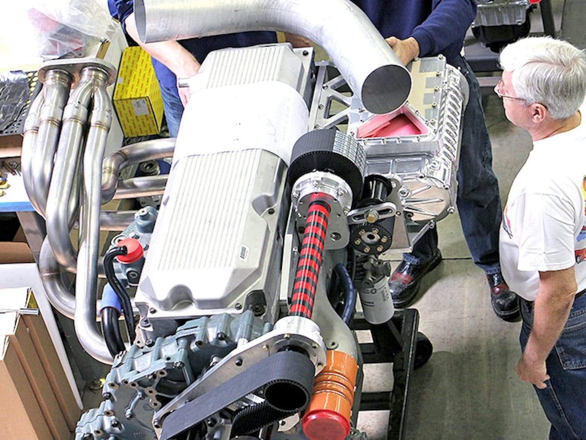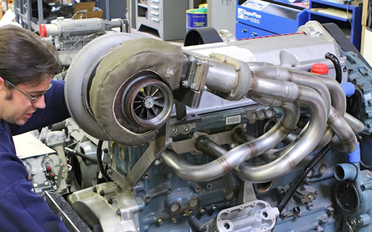 The 14.7-liter Series 60 will have a Whipple twin screw supercharger forcing air into a massive Borg Warner S510 turbocharger. The system is good for up to 3,000 cfm and potentially 180 pounds of boost, although it will likely run around 70 pounds in race tune.