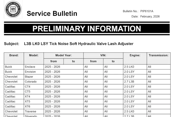 This issue isn’t new, as PIP6101A is an addendum to a previous service bulletin that addressed the same noise and the same cause in the 2.5-liter LK0 and 2.7-liter L3B engines, indicating this is a wider-spread issue than previously known. Interestingly, the initial service bulletin, PIP6101, the cause was listed as: “Manufacturing debris inside the Stationary Hydraulic Lash Adjuster (SHLA) and not allowing it to pump up with oil, resulting in a soft lash adjuster.” This isn’t a full-blown recall, but luckily, for all the engines covered by the bulletin, the earliest model year is 2025. So, owners of these engines should be covered by the manufacturer’s 5-year/60,000-mile powertrain warranty.