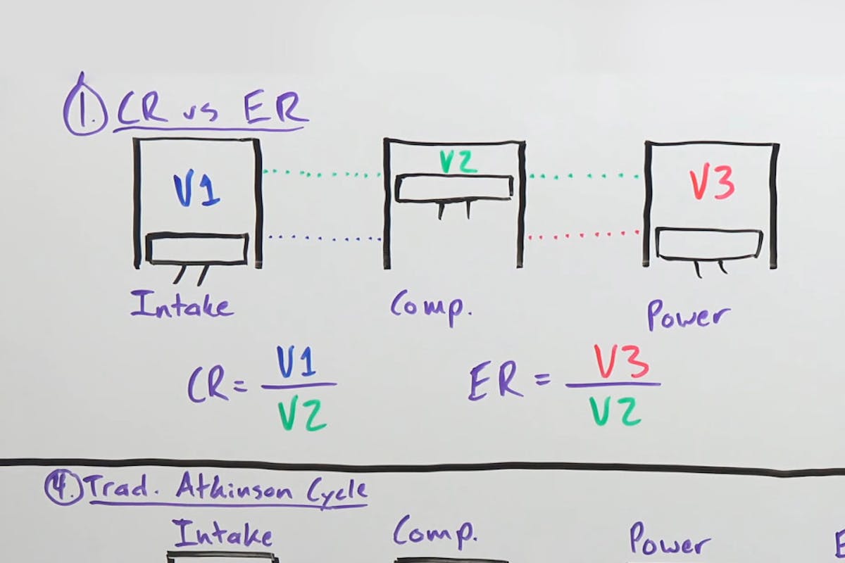 In this illustration of compression ratio (V1 and V2) versus expansion ratio (V2 and V3). If you can increase your expansion ratio compared to the compression ratio, you get more usable work out of the same amount of combustion.