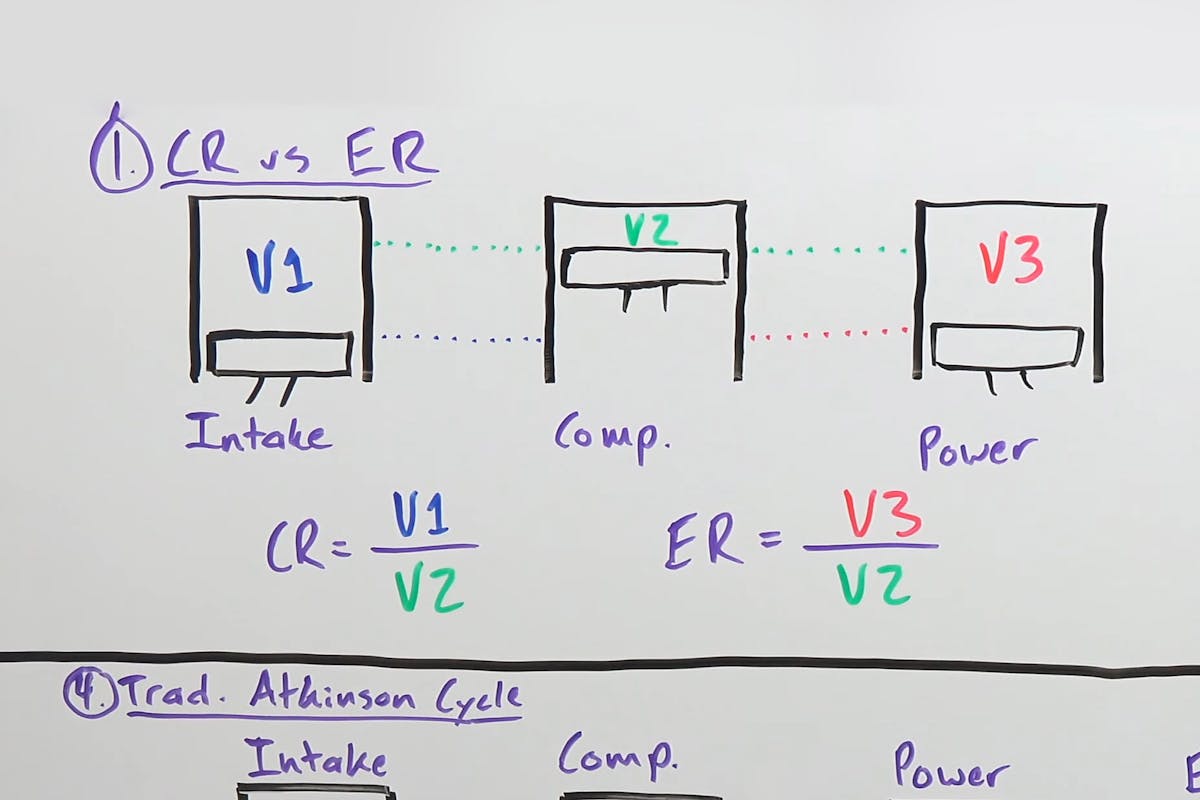 In this illustration of compression ratio (V1 and V2) versus expansion ratio (V2 and V3). If you can increase your expansion ratio compared to the compression ratio, you get more usable work out of the same amount of combustion.