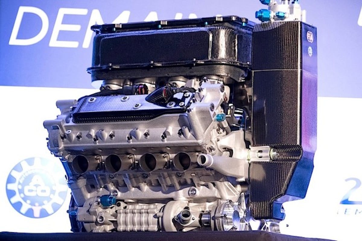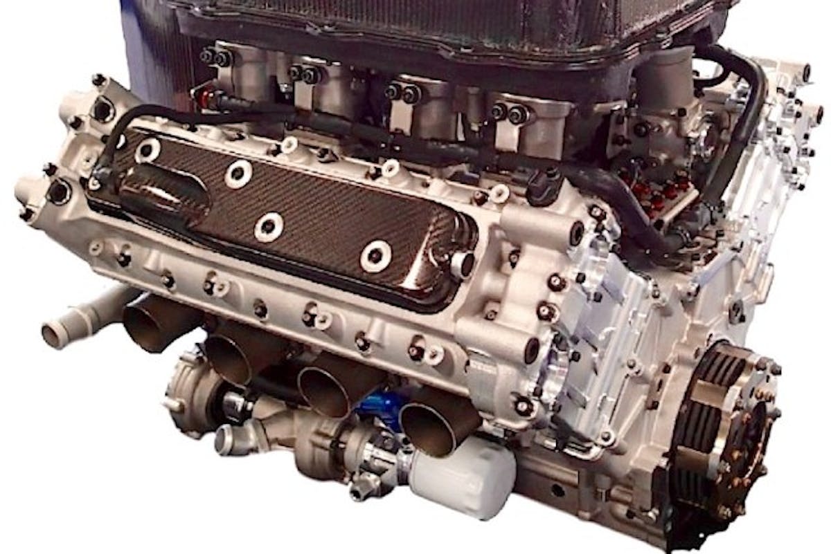 The naturally aspirated 90-degree DOHC V8 weighs just under 300 pounds and is rated at 600 horsepower with 410 lb-ft peak torque. A Cosworth ECU will control fuel and spark.