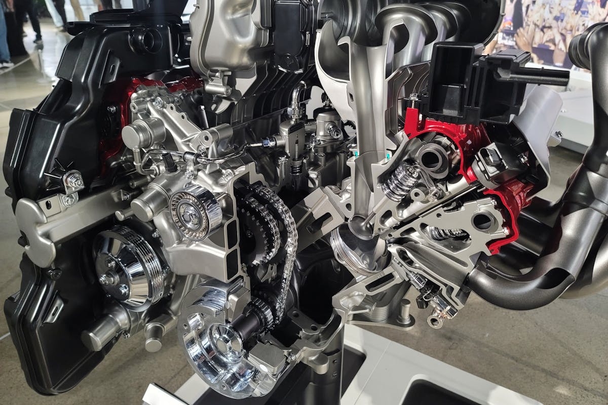 Looking into the intake manifolds, the level of effort to achieve that efficiency is obvious. Each bank has its own plenum and throttle body,  with each cylinder’s intake runner having its own bellmouth to smooth airflow into the cylinder, as well as an active intake airflow management system (no, not DOD or AFM). Direct injection is almost a given in today’s world, and the ignition system appears to be a fairly traditional coil-on-plug system mounted to the valve covers.