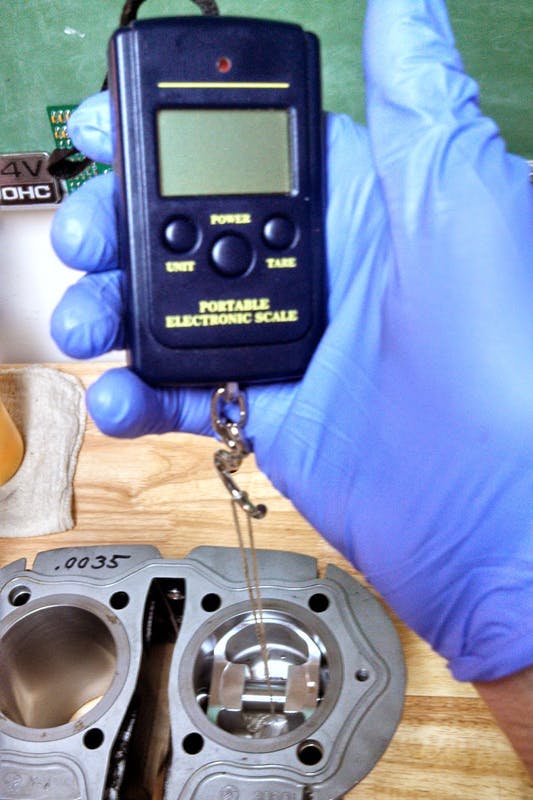 “I got the ring tension down from 6.25 pounds top, 6.75 pounds second, and 6.9 pounds oil to 2 pounds top, 2.125 pounds second, and 4.25 pounds oil. The material and design I went with was steel non-direction for the top, cast iron Napier for the second, and traditional three piece oil,” says Mills.