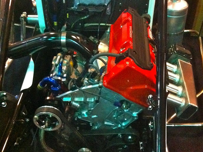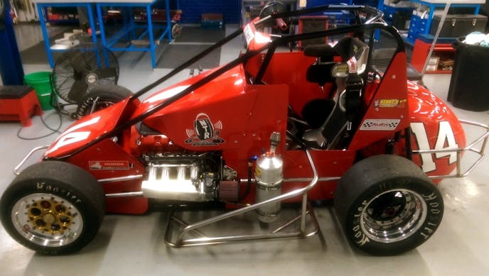 The Honda engine is also converted to dry-sump oiling with a Barnes 3-stage pump and an 8-quart reservoir. In a unique, space-saving move, USAC mounted the power-steering pump and alternator inline behind the oil pump. Since it’s driven only at half engine speed, the alternator was upgraded to provide enough juice for the electric fuel pump.