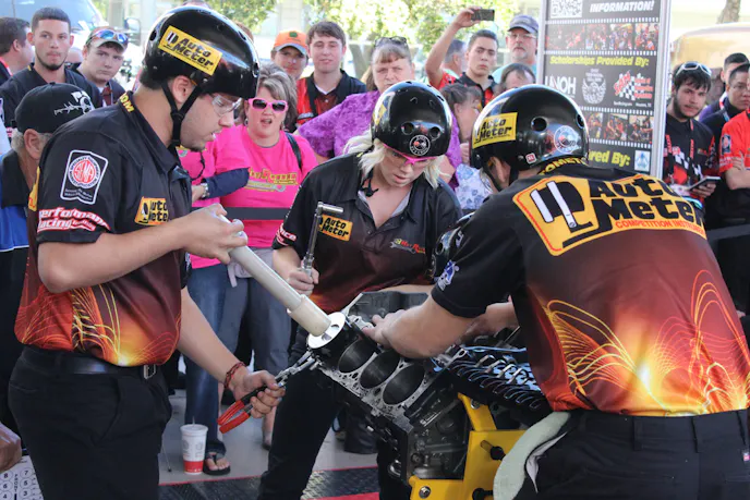Team Auto Meter, from the Eastern Oklahoma County Tech Center, set a new Engine Challenge record on their way to becoming one of the SEMA Dual Championship winners, by completing a performance engine rebuild in an astounding 18 minutes and nine seconds, with an average time of their three rebuilds during the competition of 19 minutes and 28 seconds.