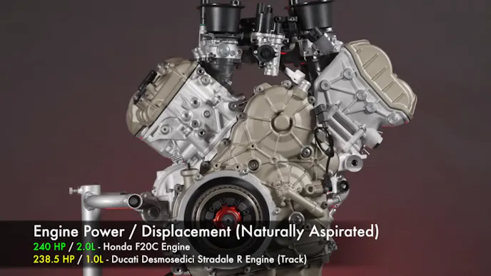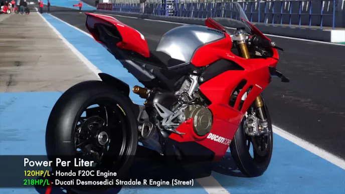 When the Honda S2000 debuted in 1999, its F20C inline-4 engine set a new benchmark for performance. The naturally aspirated two-liter inline-four produced 240 horsepower. At the time, 120 horsepower per liter was an unmatched figure in a production car. Fast forward to today, and Ducati’s one-liter V4R, in race trim, produces nearly the same total output as the F20C while using half the displacement. Even the street-legal version delivers an astounding 218 horsepower while also meeting emissions and durability requirements.