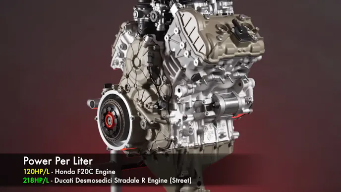 Even so, Ducati’s V4R produces more power per liter by a significant margin. The difference comes down to engine speed. The T50 reaches an extraordinary 12,100 rpm, an almost unheard-of number in the automotive world, while Ducati pushes the V4R to roughly 16,500 rpm. Higher RPM directly translates into more power strokes, increasing total power output. The challenge is building an engine that does not destroy itself at such speeds. Every internal component faces higher heat, greater stress, and stronger acceleration forces. Valve springs lose authority, piston speeds approach critical limits, and the entire mechanical assembly must resist extreme pressures. Ducati’s engineering is centered on solving these issues.