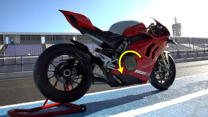 Another way Ducati pushes overall performance even further is by applying the same philosophy, that extra complexity is acceptable if it delivers results, to crankshaft rotation. Although common in MotoGP, Ducati is one of the few manufacturers to use a counter-rotating crankshaft in a street-legal motorcycle. Most street bikes have the crankshaft and wheels spinning in the same direction. For the Ducati V4R, the crankshaft’s rotation is reversed relative to the wheels. This creates several performance benefits. It reduces front-wheel lift during acceleration and rear-wheel lift during deceleration. As well as reducing the overall gyroscopic resistance acting on the motorcycle. With less gyroscopic force, the bike transitions more easily from side to side and feels more agile during rapid direction changes.